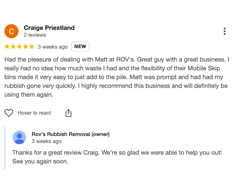 “Had the pleasure of dealing with Matt at Rov’s. Great guy with a great business. I really had no idea how much waste I had, and the flexibility of their mobile skip bins made it very easy to just add to the pile. Matt was prompt and had my rubbish gone very quickly. I highly recommend this business and will be using them again,” Craige Priestland